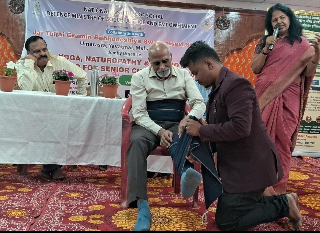 नागपूर : नॅशनल इन्स्टिट्यूट ऑफ सोशल डिफेन्स आणि जय तुळजाई ग्रामीण बहूउद्देशीय स्वयंसेवी संस्था, उमरसरा यवतमाळ यांच्या संयुक्त विद्यमाने जेष्ठ नागरिकांसाठी निःशुल्क योग, निसर्गोपचार आणि फिजिओथेरपी कॅम्प प्रचंड प्रमाणात उत्साहात संम्पन्न झाला. डॉ. श्रद्धा प्रशांत अनवाणे, डाएट, योग, निसर्गोपचार तज्ञ् कॅम्प यांच्या मार्गदर्शनाखाली झाला. व कार्यक्रमाचे आयोजन आकार मल्टिपरपज फॉउंडेशन नागपूरच्या अनिता मसराम (9881703300) यांनी केले. राम मंदिर रामनगर चे अध्यक्ष कार्यक्रमाचे मुख्य अतिथी रवी वाघमारे प्रामुख्याने उपस्थित होते. 13 फेब्रुवारीला राममंदिर, रामनगरमध्ये वरिष्ठ नागरिकांनी भरभरून लाभ घेतला. या कार्यक्रमात पहिले स्वागत, नंतर उपस्थितांनसाठी मधुमेह, रक्तदाब व इतर व्याधीनंवर निसर्गोपचार व त्याकरिता काय पोषक आहार घ्यावा. यावर प्रात्यक्षिकासह, तज्ञाचे मार्गदर्शन आणि कार्यक्रमाचा सरते शेवटी संगीतमय फिजिओनृत्य सादर करून झाला.